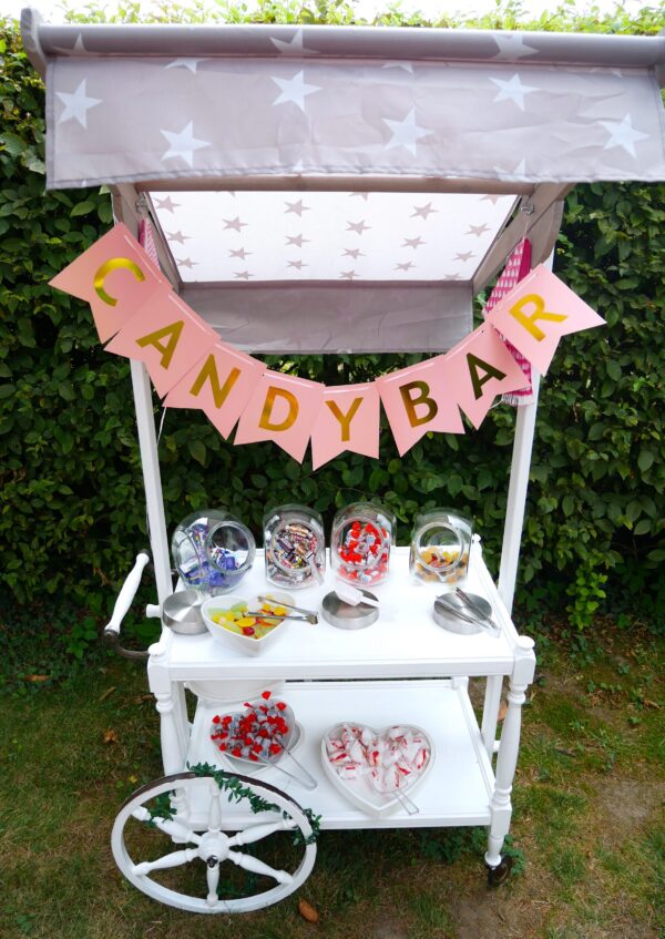 Eine Candybar oder auch Saltybar ist heutzutage von Feiern kaum noch wegzudenken. Ausgestattet mit diversen Naschereien oder Salzstangen, Chips etc. ist sie bei den Gästen, vor allem bei den Kleinen, sehr gern gesehen.