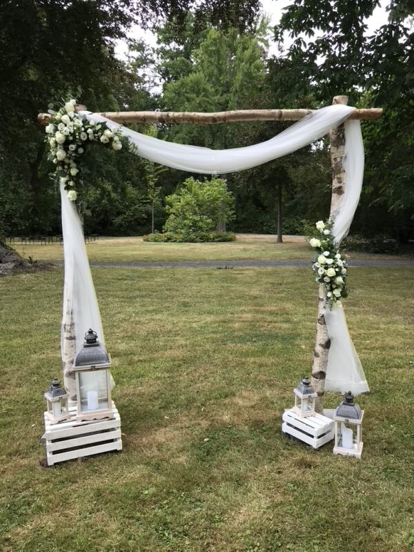 Mit dem weißen Tuch und Blumen aus eurem Blumenkonzept bietet er einen tollen Rahmen.